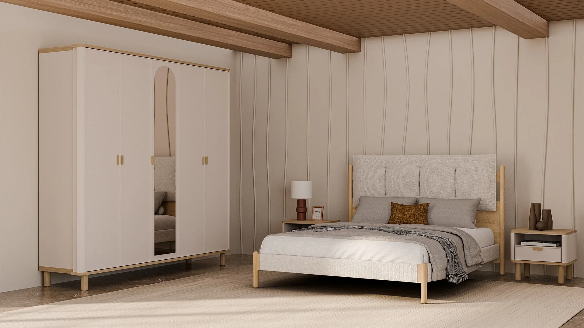yatak odasında düzenli, sakin ve zamansız bir atmosfer oluşturur.