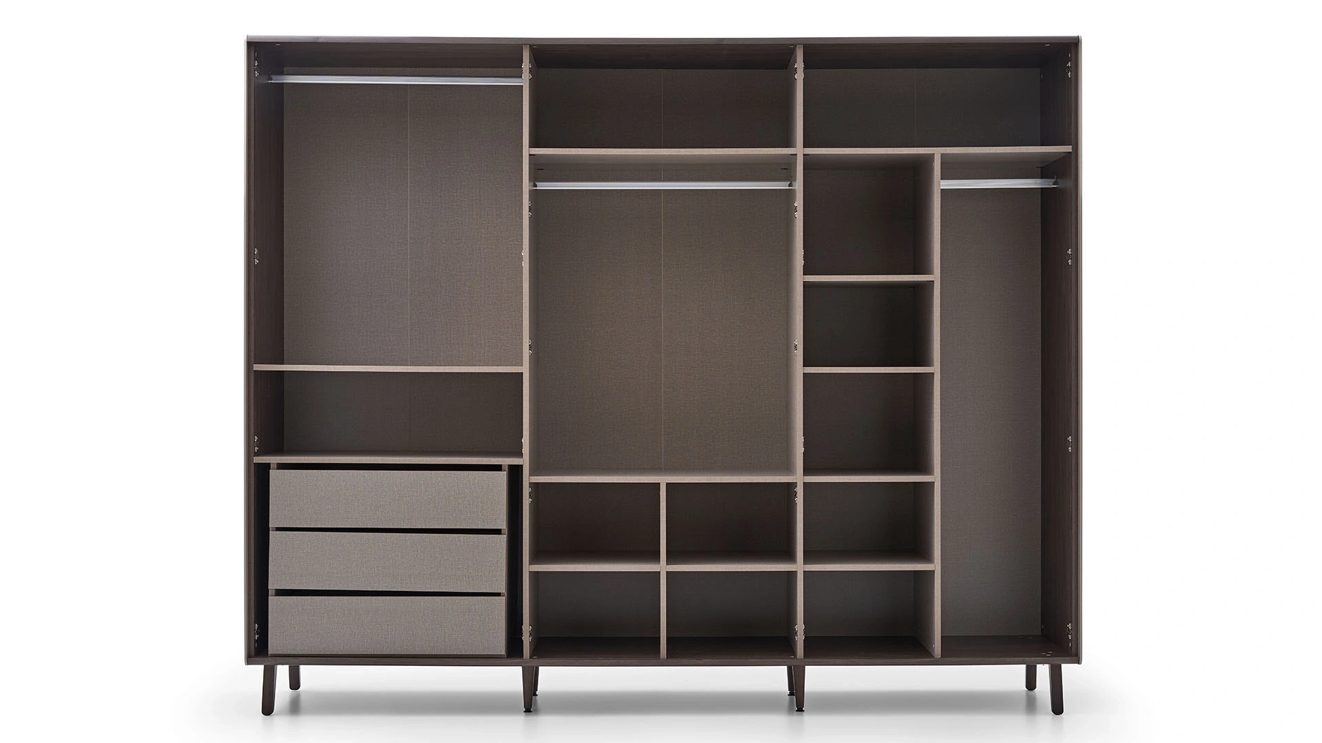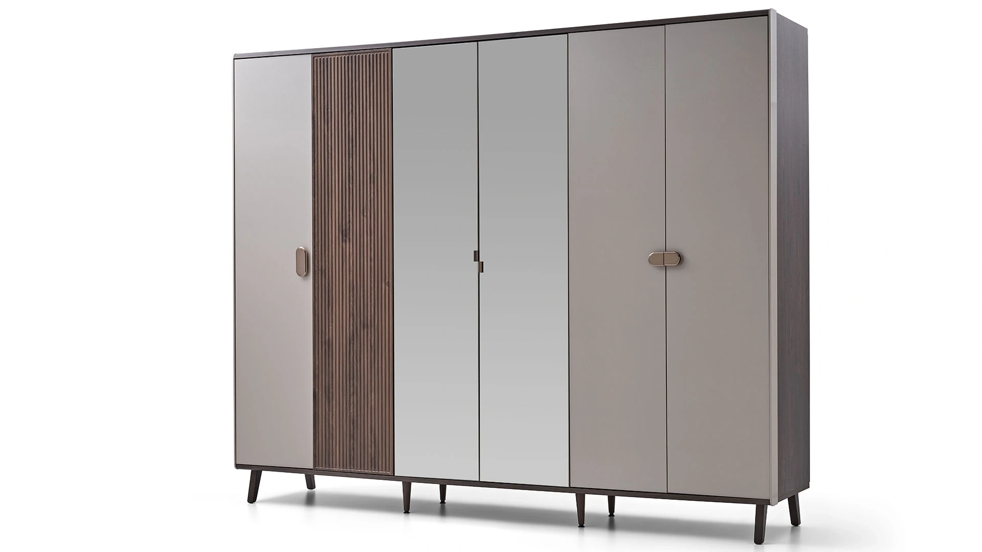 The 6-door wardrobe, with its stylish and elegant design, wide and practical interior layout, wins admiration. You can choose this wardrobe for your bedroom or dressing room, with its bronze coated handles, easy-to-clean and elegant wooden legs, and profile details in the door design that personalize its appearance.