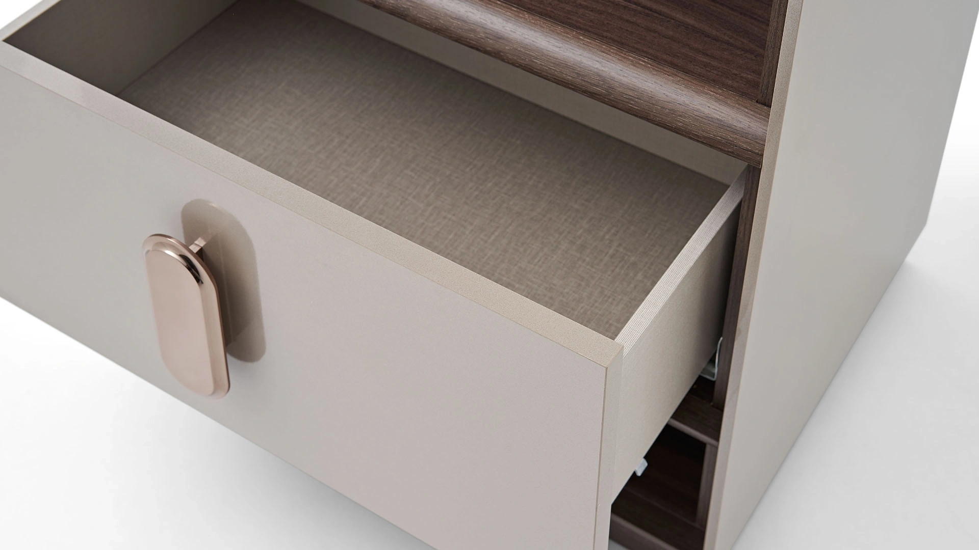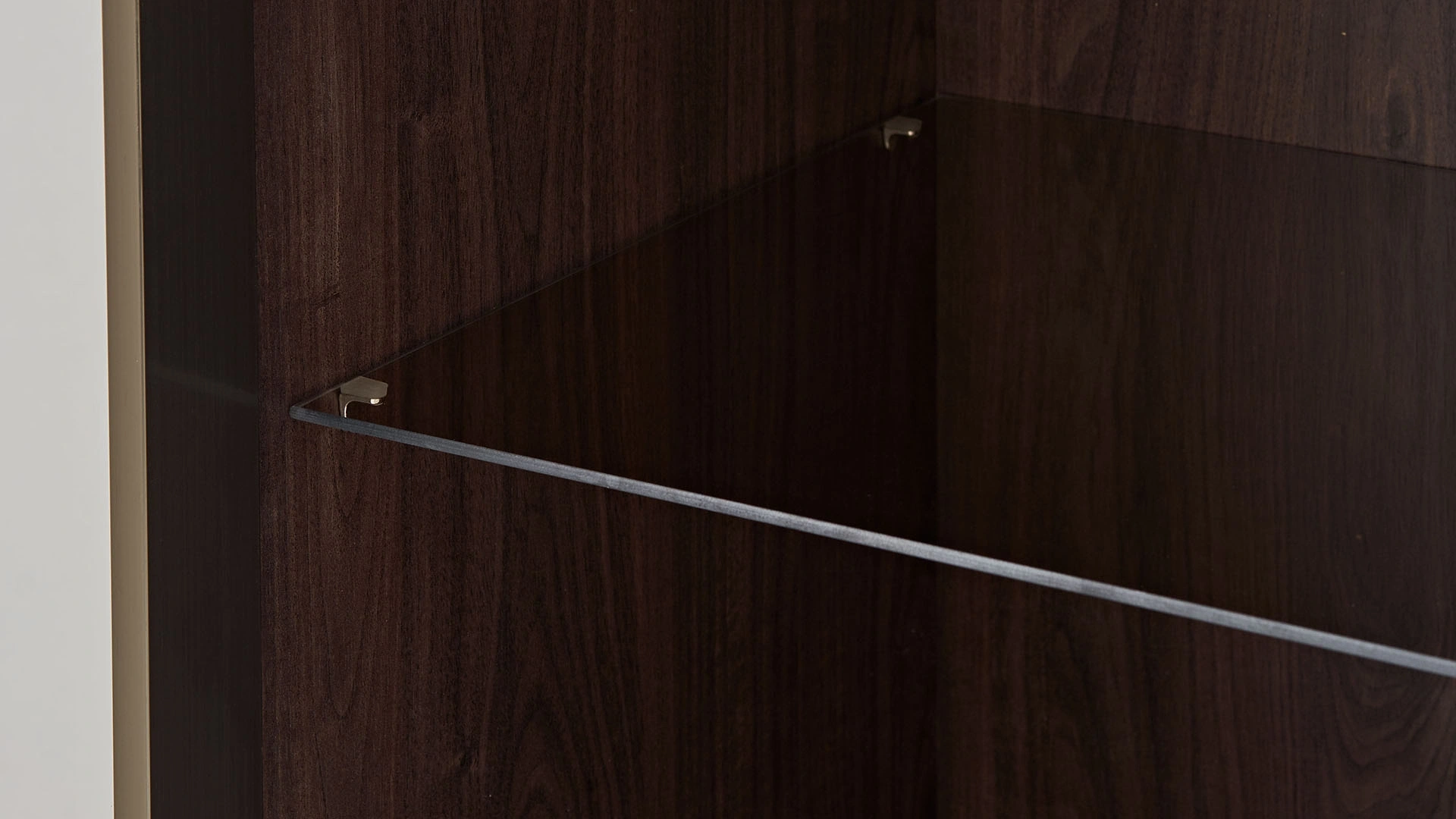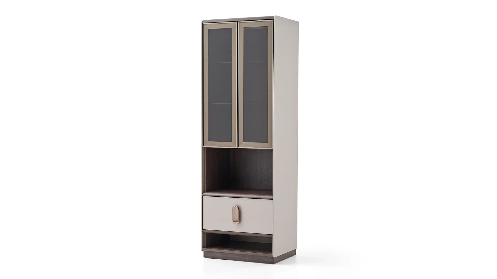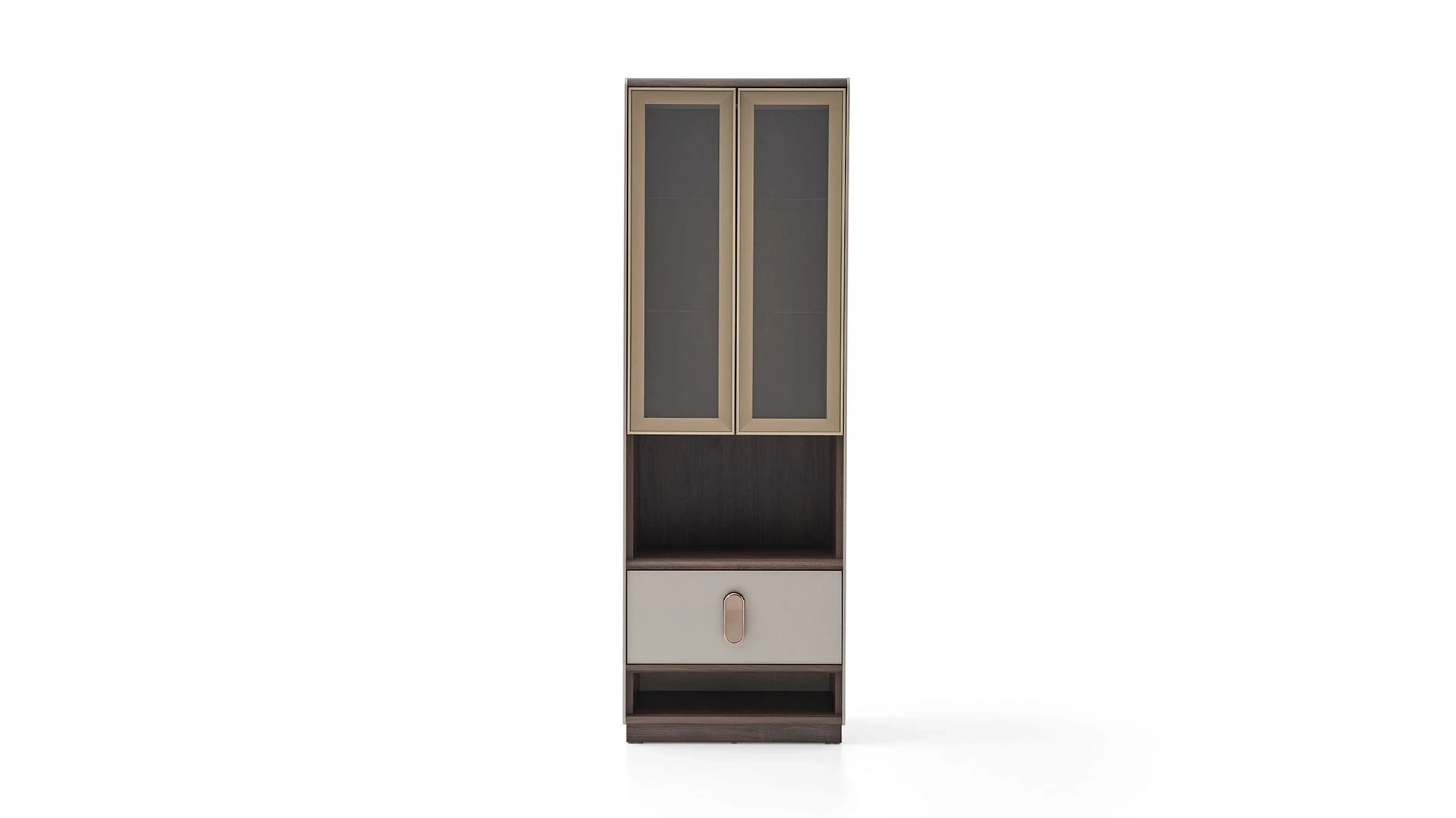 The side module of the Bend TV unit adds a nice touch to your decoration while completing the Bend TV unit. The vertically shaped TV unit module gains admiration with its bronze glass-covered showcase area located within an aluminum frame and LED lighting. You can purchase the side module with drawer and open shelf area either on its own or with other Bend TV unit modules.