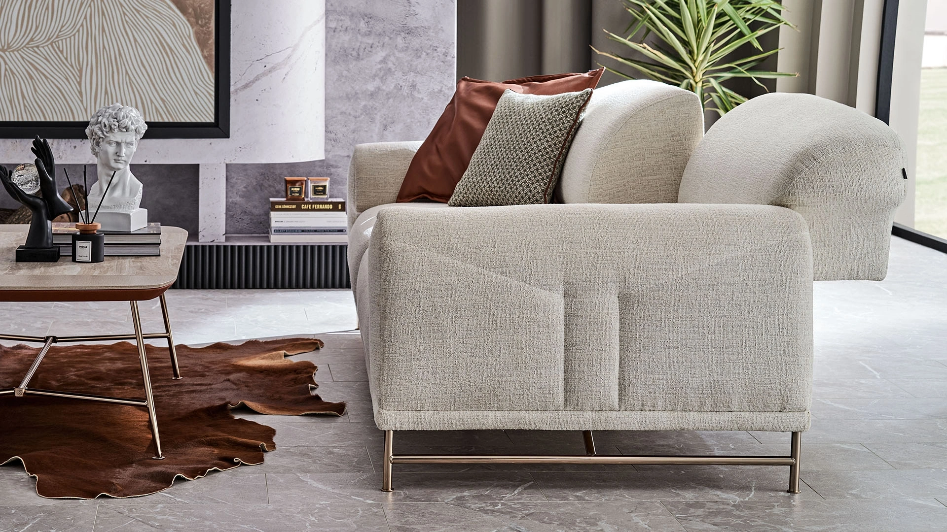 The Brita metal-legged triple sofa with a bed adds comfort to your spaces. With its feature of being able to turn into a bed, the product ensures extra comfort for both you and your guests, while also adding beauty to your decoration with its golden metal legs and elegant lines. You can purchase the Brita triple sofa that combines comfort and elegance either on its own or together with other Brita products. The Brita metal-legged triple sofa with a bed adds comfort to your spaces. With its feature of being able to turn into a bed, the product ensures extra comfort for both you and your guests, while also adding beauty to your decoration with its golden metal legs and elegant lines. You can purchase the Brita triple sofa that combines comfort and elegance either on its own or together with other Brita products.