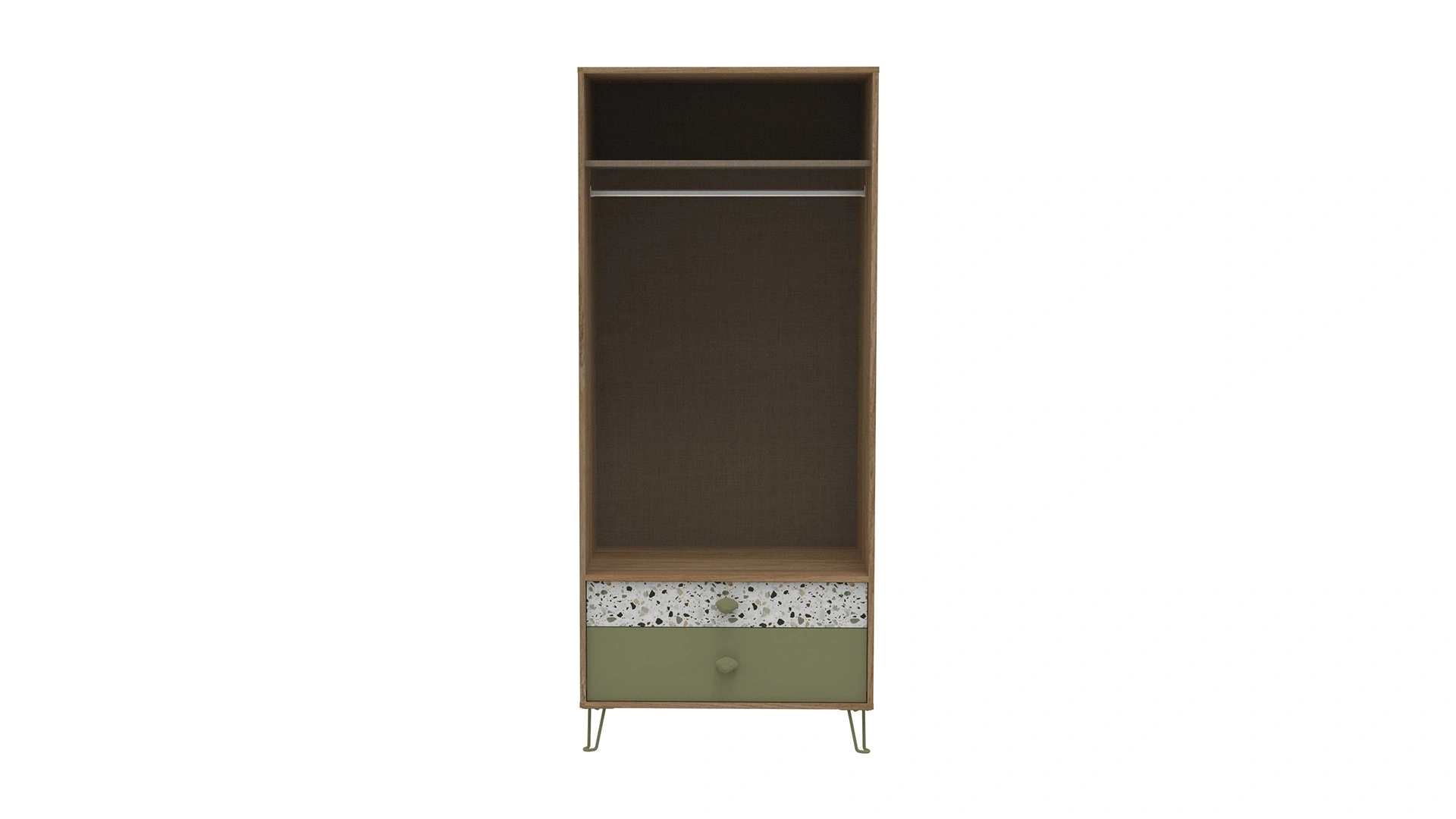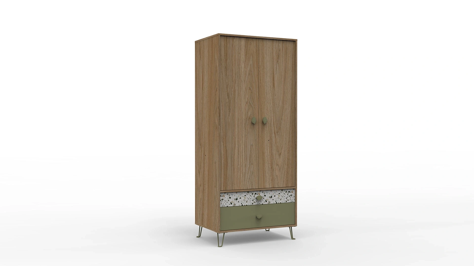 The 2-door cabinet, inspired by the elegant geranium flowers from nature, which are one of the key pieces of the Greta collection, gives spaces a natural look. You can purchase this product, which adds color to the simplicity of wood with its green and terrazzo patterned drawers, green-colored legs, and green handles, together with Greta youth bedroom furniture.