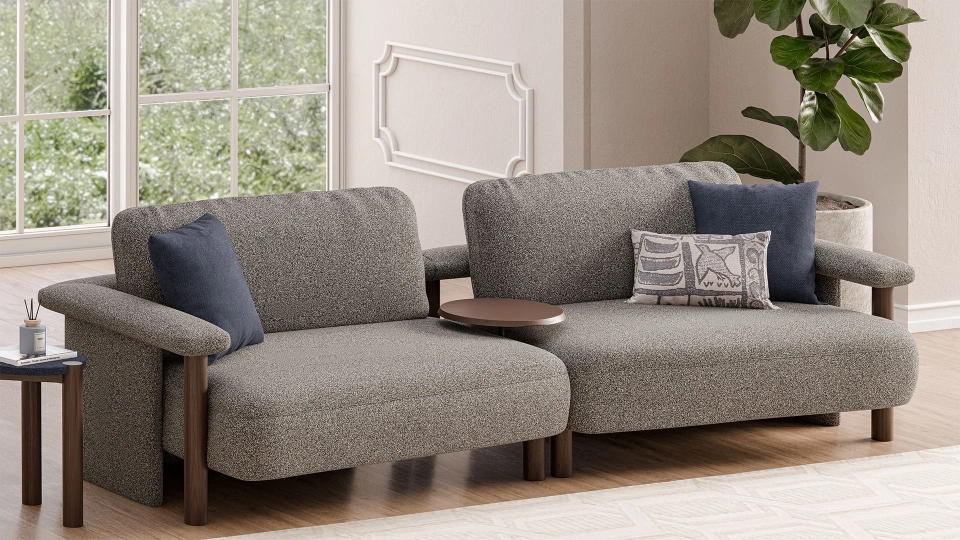 Designed for lovers of modern interiors, the Joseph Sofa Set includes a four-seater sofa, corner chaise module, pouf, coffee table, and armchair. Upholstered in shades of grey and blue with walnut legs, this set creates a calm and stylish atmosphere. Its soft yet durable cushions offer long-lasting comfort for everyday use.