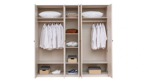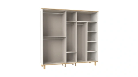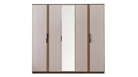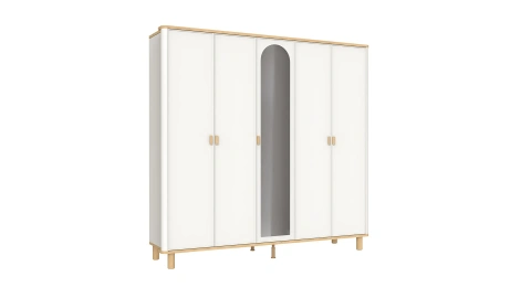 LEGNA 5 Kapaklı Dolap, modern tasarımı ve işlevsel yapısıyla yaşam alanınıza düzen kazandırıyor. Dolabın merkezinde yer alan aynalı kapak odanızın daha geniş ve ferah görünmesine katkı sağlıyor. Dört ayrı askılığı ve raflarıyla dolabın içerisine giysilerinizi düzenli şekilde yerleştirebilirsiniz. Yumuşak beyaz renk ve ahşap detaylarla harmanlanan tasarımını fonksiyonel iç tasarımla tamamlayan LEGNA 5 Kapaklı Dolap, yerden yüksek ayak tasarımıyla ise temizliği kolaylaştırıyor.
