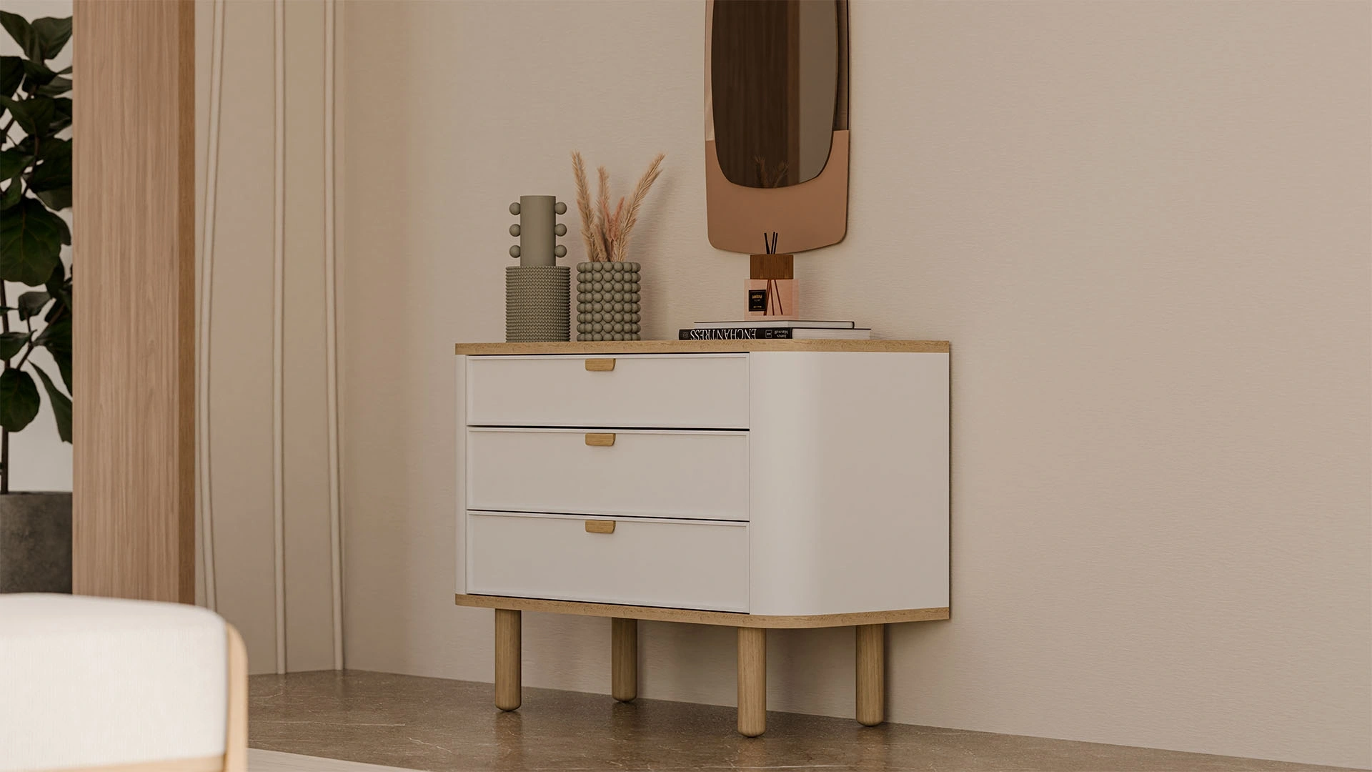 Zarif ve fonksiyonel tasarımıyla LEGNA Geniş Şifonyer, yatak odanızdaki eksik parçayı tamamlıyor. Üç çekmeceli yapısı, depolama ihtiyacınızı karşılamak için ideal çözüm. Şifonyerin yerden yüksek ayakları ise modern görünüm oluşturuyor. Aynı zamanda temizlik sırasında çekme ihtiyacını ortadan kaldırıyor. LEGNA Geniş Şifonyer, İskandinav dekorasyona hitap eden açık renk ahşap ve krem tonlarından oluşuyor. Ayak kısmı, üst kısmı ve kulpları açık renk ahşap tonlarında. Böylece yatak odanızda doğal ve sıcak bir atmosfer elde edilebiliyor.