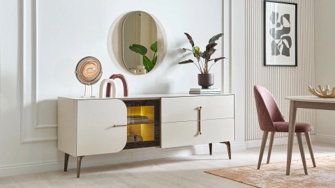 The Nicole console appeals to those who want to create a different style in their dining room. With its bronze glass top and internal lighting application, the console creates a pleasant ambiance, and with its linear bronze handles, it also gains a luxurious look. You can purchase our product to create a special dining room decoration.