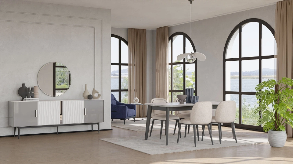 Modern ve lüks stil koleksiyon oluşturmak için tasarladığımız Nita Koleksiyonu, minimalist bir yaklaşımla birleştirilmiş temiz hatlar, kaliteli ve dokusunu hissedebildiğimiz dekorları ve dikkat çekici detaylarıyla karakterize edilmiştir. Tasarımda dikkat çekici alanlar belirlenerek, sade ve kullanışlılığın ön planda olması beklenmektedir. Parlak laminasyona sahip sunta lam dekoru, doğal taş dokusuna sahip dekorla kullanılmıştır. Füme renk metal detaylı ayakları koleksiyona güçlü duruş etkisi sağlamaktadır. Koleksiyonda füme ayna, nötr ve yumuşak tonlar, beyaz, bej, gri ve füme renkler kullanılmıştır. Bu özelliklerin kombinasyonuyla, modern ve lüks koleksiyon tasarımı ortaya çıkmıştır.Nita Koleksiyonu modern yapısının yanında iddialı duruşun bir simgesi.  Gövdedeki sedefli gri renk ve füme ayna ürüne parıltı ve yansıma sağlarken, organik formlu kapaklar ile özgün doku ve renklerin uyumunu yakalıyor. Adeta bir kanyonu anımsatan üç boyutlu kapaklarıyla doğanın gücünü hissettiren benzersiz bir koleksiyon. Zarif metal ayaklar ve metal çerçeveli mermer kulpları ise koleksiyonu tamamlayan eşsiz detaylardandır.
