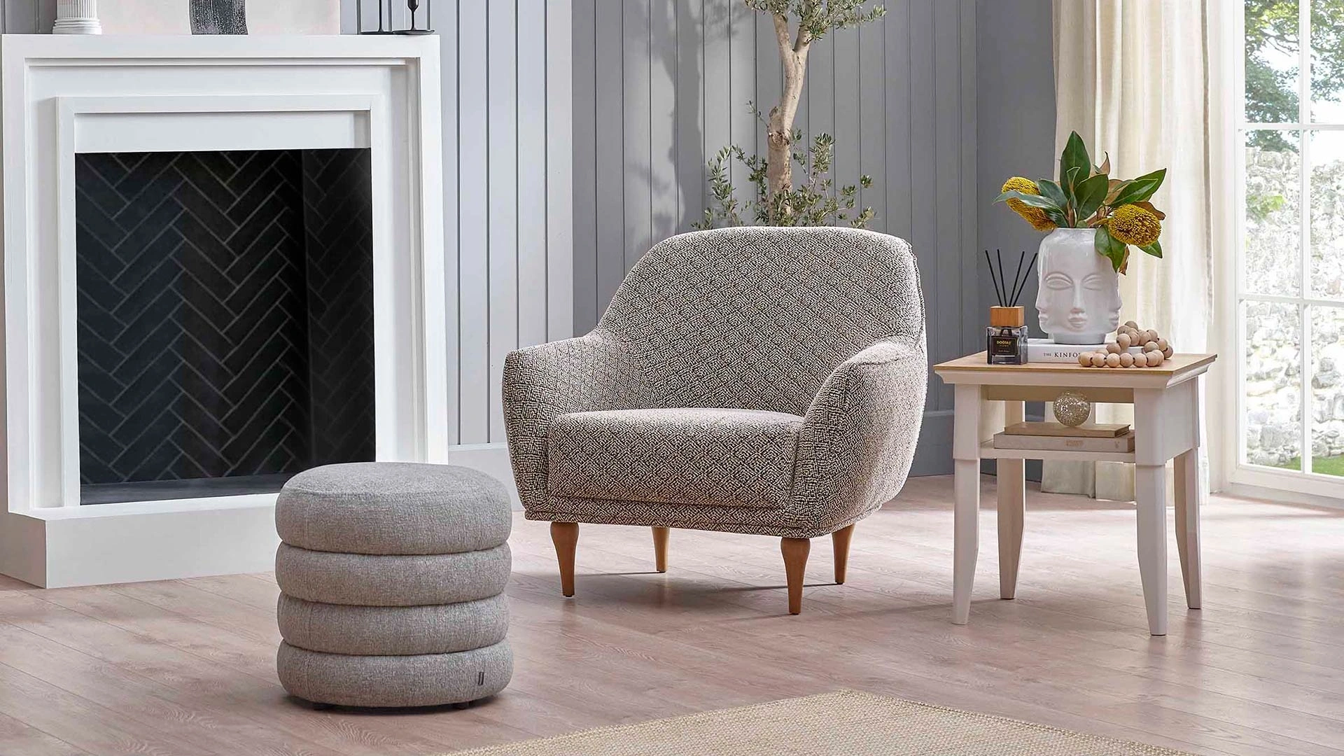 The Toscana makeup table pouf, which will perfectly complement your bedroom with its elegant and natural style, stands out with its comfortable structure. You can easily match the product to your decor with its stitching details and light color. Buy the product now.