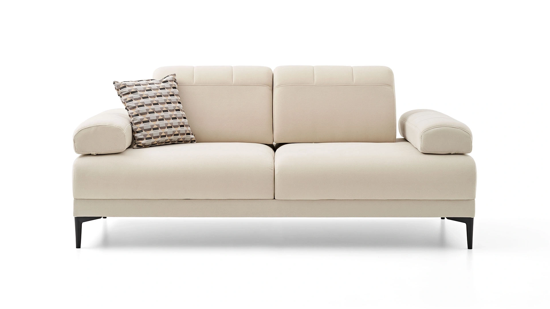 Trento two-seater sofa, which has modern and simple lines that are admired, is ideal for those who want to create an innovative decoration. You can buy Trento two-seater sofa with its light-colored fabric upholstery and contrast look with black, thin legs right now.