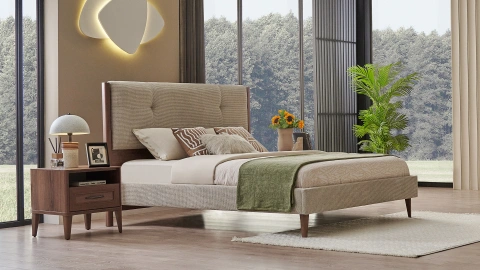 Vermont Karyola'nın 180x200 cm'lik bu özel ölçüsü, çok daha geniş bir uyku alanı arayanlar için en iyi seçimler arasında. Ceviz rengi gövdesi ve krem rengi kumaş döşemesiyle ortama aydınlık ve ferah bir hava kazandıran bu model, özellikle İskandinav tarzları sevenlerin favorisi arasında. Yaşam alanınızda ahşabın doğal dokunuşunu arıyorsanız sizin için en iyi seçimler arasında yer alan Vermont Karyola, yüksek ayak yapısıyla temizliği de kolaylaştırıyor. Bu sayede hem fonksiyonellik hem de modern görünüm bir araya geliyor.