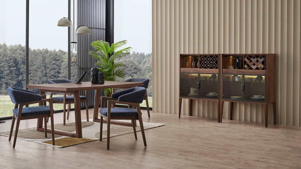 | Yemek odaları sevdiklerinizle birlikte en güzel paylaşımları yaptığınız yerlerden. Bu alanı doğru eşyalarla dekore etmek önemli. Vermont Yemek Odası Takımı ise sadelik ve şıklığı bir araya getiren ürünler arasında yer alıyor. Bu takım, sabit ve açılır yemek masası seçenekleri, konsol, ayna, kollu ve kolsuz sandalye gibi parçalara sahip. Bununla birlikte salonunuzu zenginleştirecek orta, yan ve zigon sehpalar da takımla birlikte alabileceğiniz parçalardan. Krem ve lacivert gibi kumaş seçenekleri, ürünlerin ceviz rengi gövdesiyle kusursuz uyum yakalıyor. Ayna ise yemek odanızda daha geniş ve ferah bir hava elde etmenizi sağlıyor. |