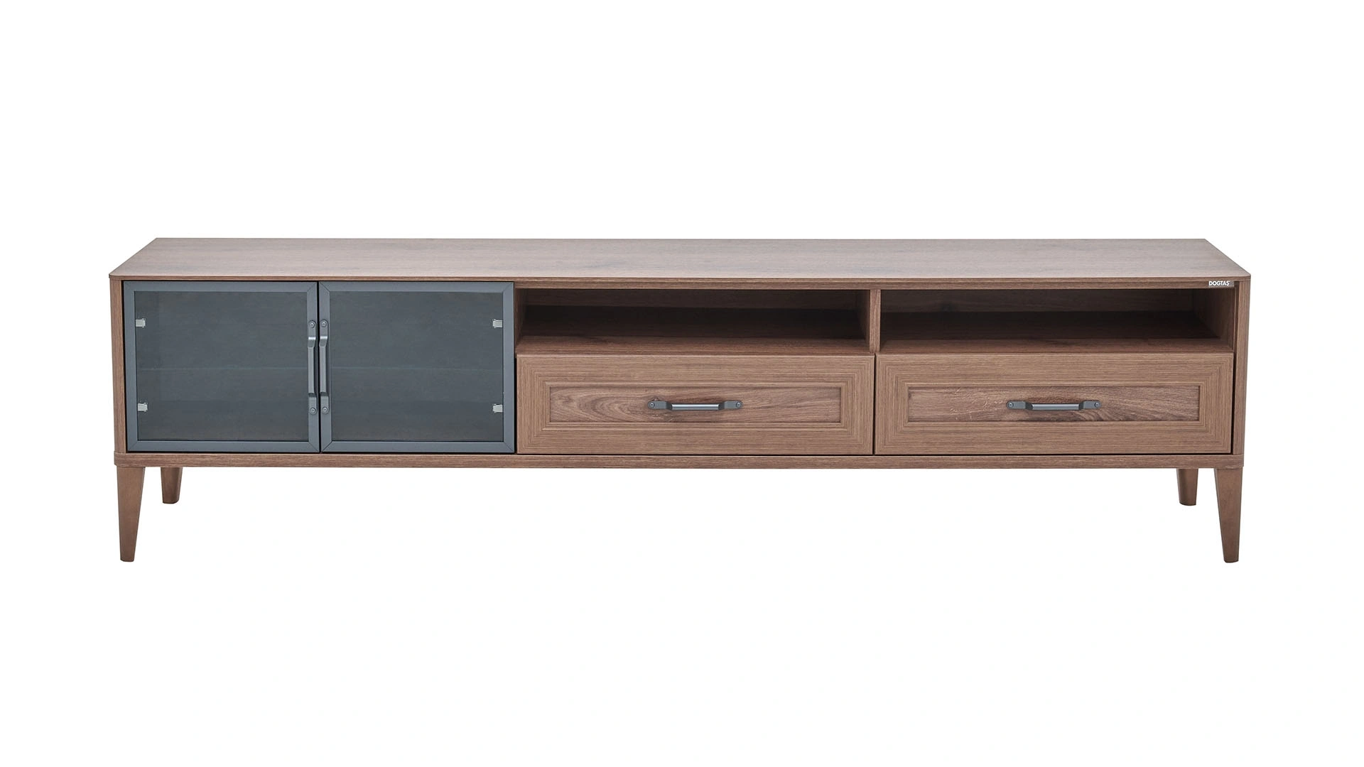 If you have enough space on your TV wall, the 210 cm Vermont TV Unit Base Module is just for you. With its walnut color and natural wood look, this product reflects the warmth of the environment, with wide 2 drawers and open shelf compartments. On the left side, there is a glass cabinet that adds movement to the unit's appearance. This unit, which you can enrich with decorative accessories, offers extra storage space thanks to its drawers.