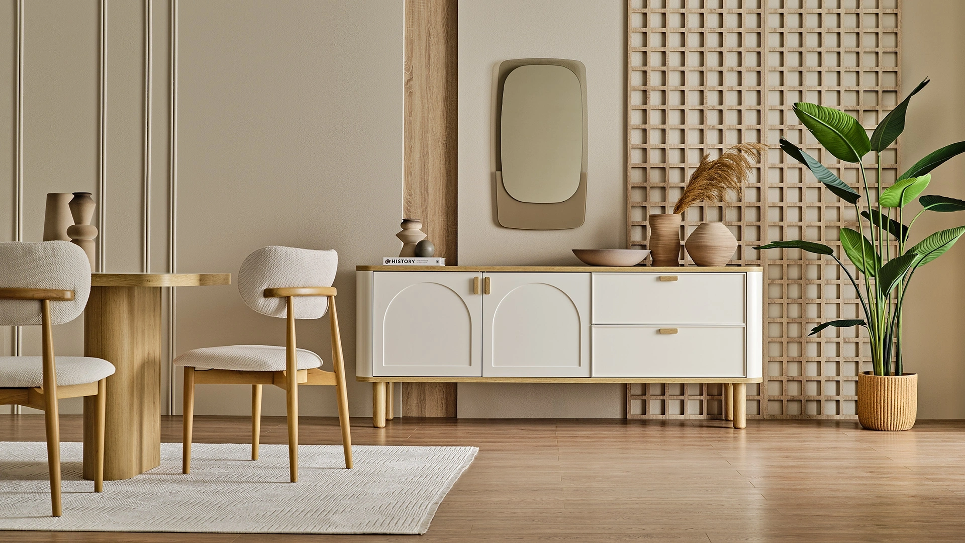 LEGNA Konsol, tasarımı sayesinde yemek odanızın en dikkat çeken parçalarından biri olmaya aday. İki çekmeceye ve kapaklı göze sahip olan bu konsolda misafirleriniz için ayırdığınız yemek takımı, çatal bıçaklar ve bardakları saklayabilirsiniz. LEGNA Konsol da üst yüzeyi ve ayaklarıyla doğal ahşap tonları sunuyor. Kalan yüzeyler ise krem rengiyle tamamlanıyor. Ahşap kulplarıyla tasarımını pekiştiren LEGNA Konsol, fonksiyonel ve modern tüm özellikleri bir araya getiriyor.
