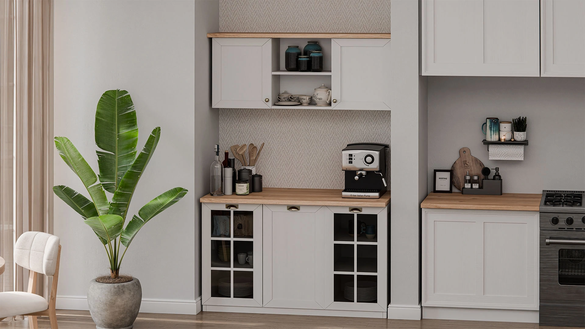 Şıklığıyla göz kamaştıran Loures Mutfak Bangosu, kahve köşeleri ya da mini servis alanları için en iyi çözümler arasında yer alıyor. Rustik beji tonları, sıcak ahşap dokusu ve yüksek ayak yapısıyla hem kullanışlı hem ferahlatıcı olan Loures Mutfak Bangosu Alt Modülü, cam detaylı kapaklarıyla da ön planda. Bu kapaklar,özel tabak takımlarınızı, kavanozlarınızı düzenli şekilde sergilemeniz için birebir. Orta bölme ise mutfak düzeninizi tamamlayacak ekstra saklama alanı sağlıyor. Üst modülle mükemmel uyum yakalayan Loures Mutfak Bangosu tam size göre!