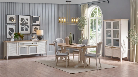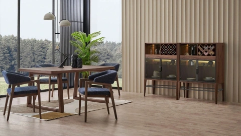 Karşınızda Moderna koleksiyonunun en nadide parçalarından biri: Moderna Vitrin. Ceviz rengi gövdesi ve cam kapaklarıyla oldukça şık bir görünüm ortaya koyan Moderna Vitrin, yemek takımlarınızı, kadehlerinizi, su takımınızı ve diğer servis gereçlerinizi düzenli şekilde dizebilmenize olanak tanıyor. Vitrinin mermer ayak detayı ise tasarıma ekstra hareket ekliyor. Tüm tasarım özellikleriyle Moderna Vitrin, yemek odanızı kusursuz şekilde tamamlıyor.