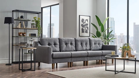 Robin dörtlü koltuk, geniş aileler ve geniş mekanlar için konforlu, şık ve kullanışlı bir koltuk arayanların beğenisini kazanıyor. Kapitone dikiş detayları, ahşap ayakları, koyu renkli, kaliteli kumaşı ile görünümünü tamamlıyor. Geniş mekanlarınız için modern ve fonksiyonel bir koltuk arıyorsanız Robin dörtlü koltuğu satın alabilirsiniz.