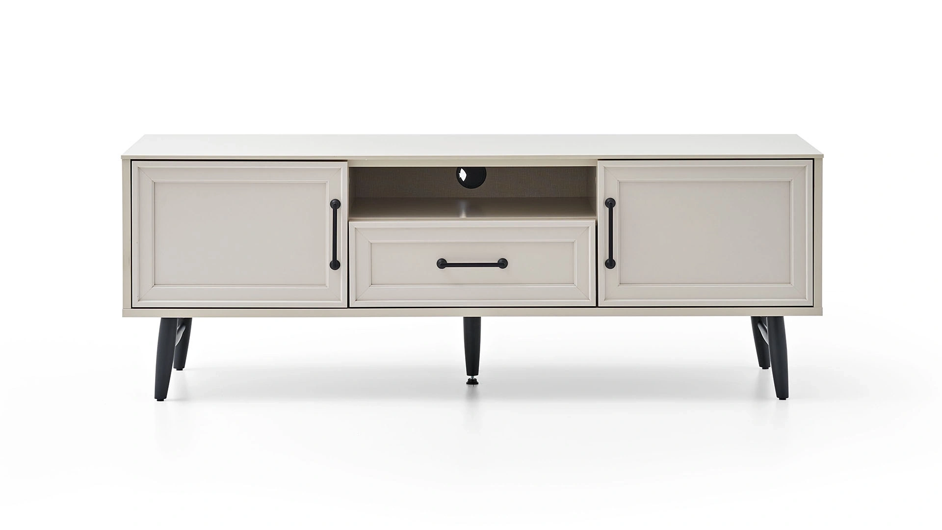 Trento TV ünitesinin 150 cm genişliğindeki alt modülü, şık ve kullanışlı tasarımıyla yaşam alanlarınızda yerini alıyor. Açık renkli tasarımın siyah renkli ayak ve kulp detayları ile bir araya geldiği mobilya, depolama ve sergileme alanlarıyla beklentilerinizi karşılıyor. Siz de eviniz için Trento TV ünitesinin alt modülünü tercih edebilir, ürünü tamamlamak için diğer modüllere de göz atabilirsiniz.